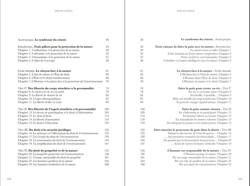 Cette 2e édition de l’ouvrage, profondément humaniste, rappelle les qualités de l’homme, explicite le droit de l’environnement pour en faciliter l’appropriation par le lecteur/citoyen, ouvre des pistes de réforme notamment du droit de propriété, faisant de la nature un bien commun dont l’homme serait le gardien plus que le propriétaire. Il appelle à la prudence face aux discours radicaux qu’il déconstruit tant sur le plan biologique, que juridique, philosophique et sociologique.