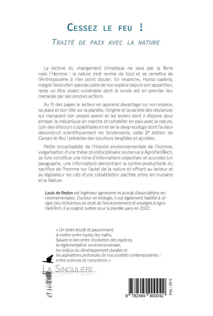 L’information, c’est le pouvoir. Au fil des pages, le lecteur en apprend davantage sur son espèce, sa place et son rôle sur la planète qu’il partage avec la Nature, l’origine et la variété des déviances qui menacent son propre avenir et les armes dont il dispose pour enrayer la mécanique en marche et cohabiter en paix avec la Nature. Loin des discours culpabilisateurs et de la deep ecology dont l’auteur déconstruit les fondements, Cessez-le-feu ! promeut des solutions tangibles.